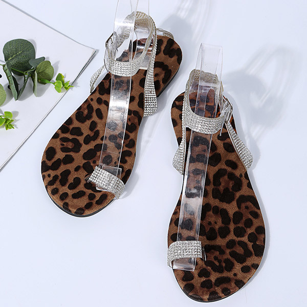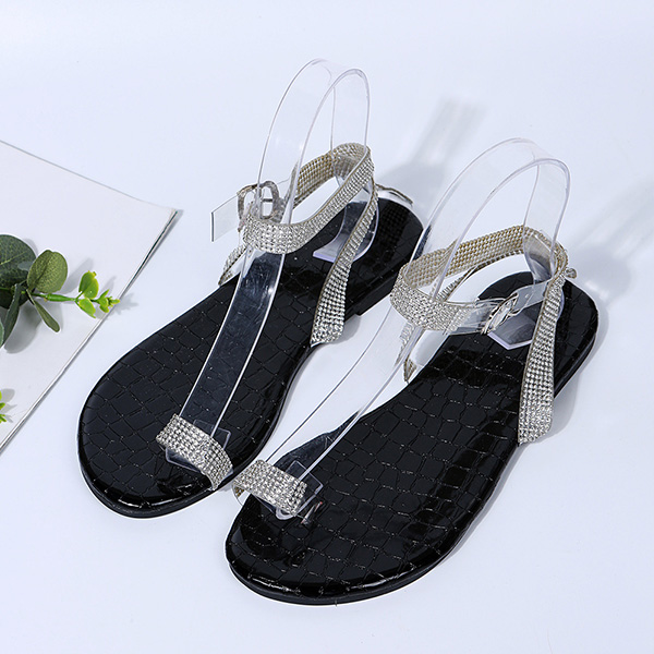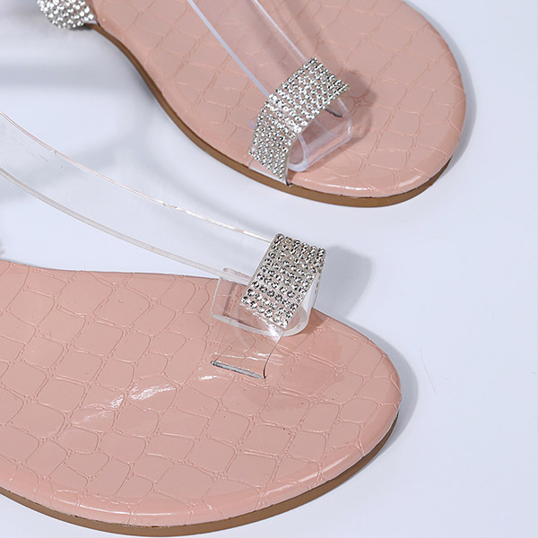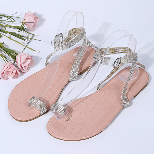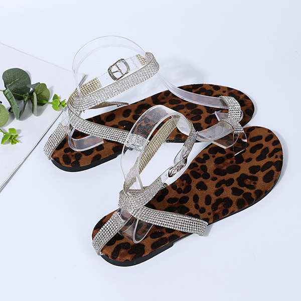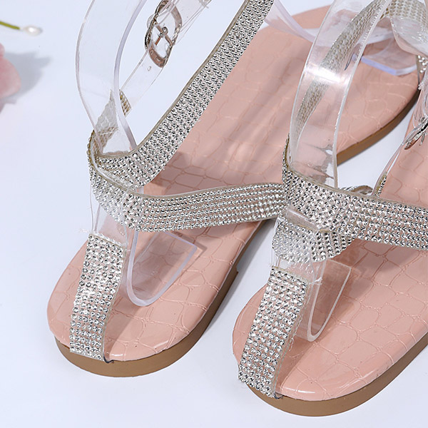 A pair of sandals featuring a cross-criss design with rhinestone details, toe loop, and a low heel.