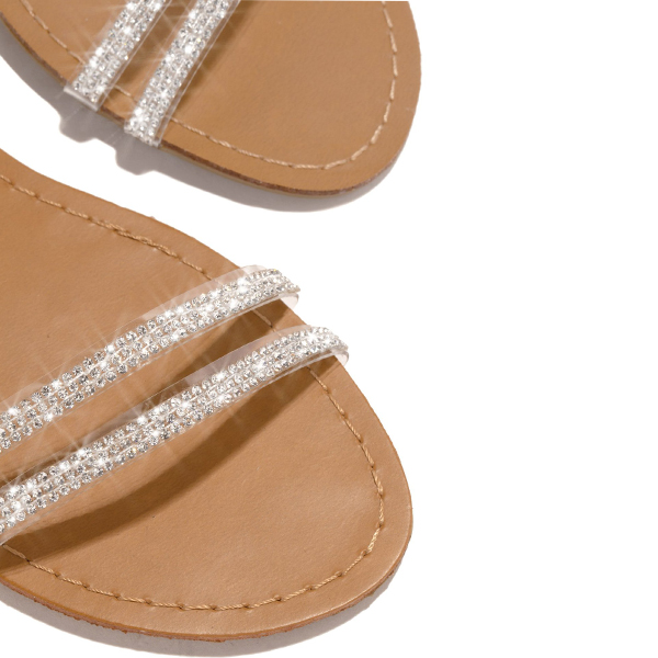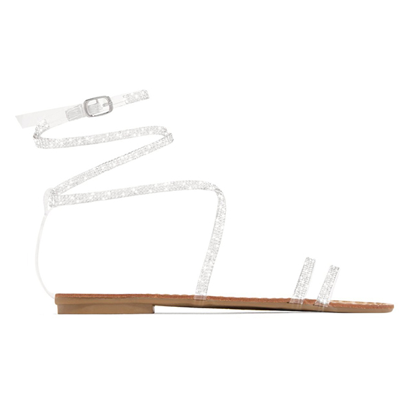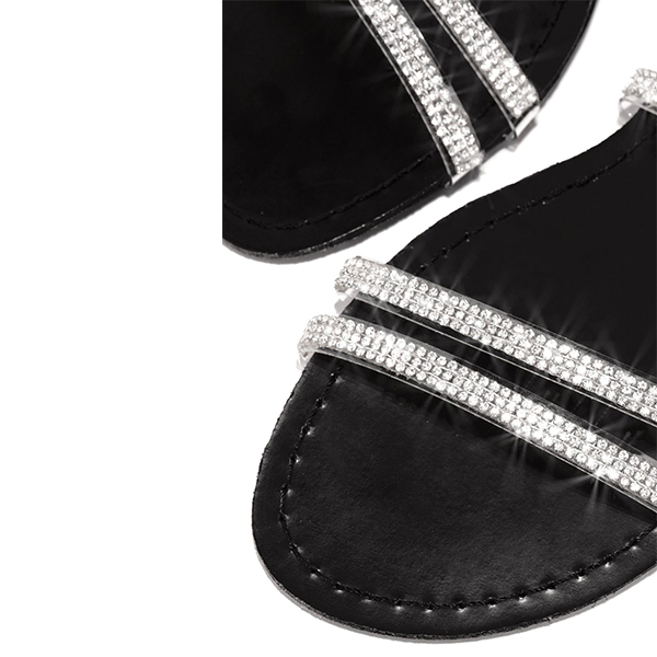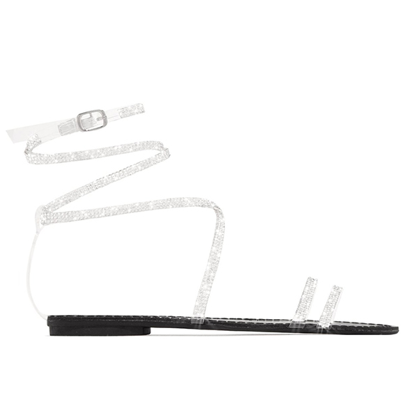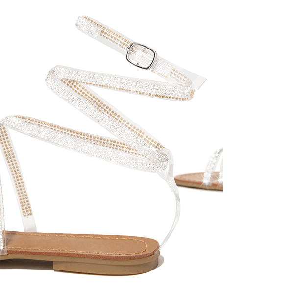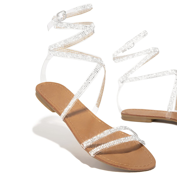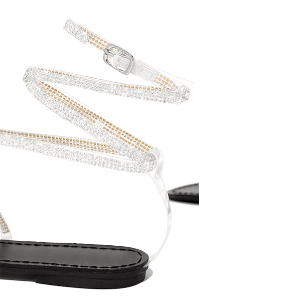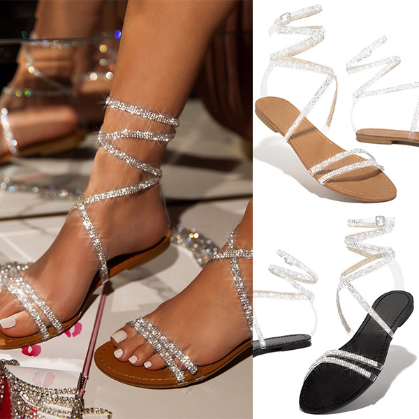 Only need one glance,you would be attracted by this pair of cozy yet stylish sandals. The flat heel and anti-slip sole design can give you a safety and comfortable wearing feeling,while the rhinestone details and lace-up design around the ankle part make it look more shinning and attractive. Try to match with your beautiful dress for a charming summer look!