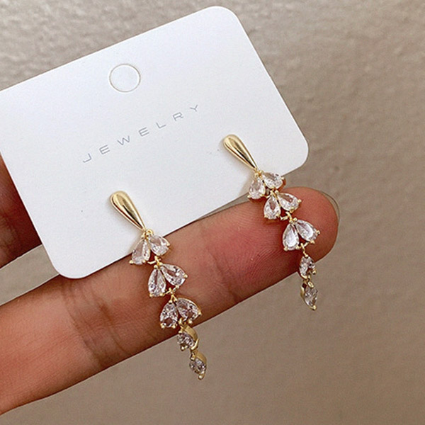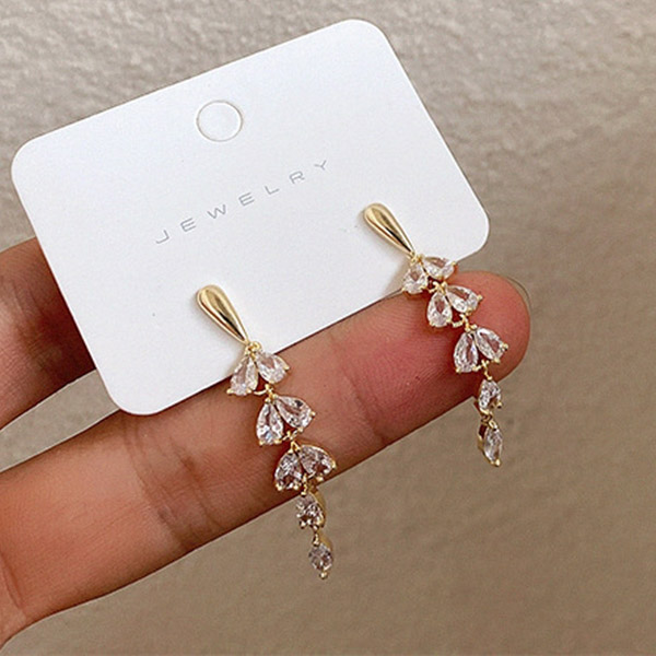 Fashion Rhinestone Inlaid Leaf Tassel Earrings