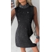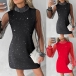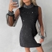 Fashion Rhinestone Mock Neck Gauze Spliced Long Sleeve Bodycon Dress