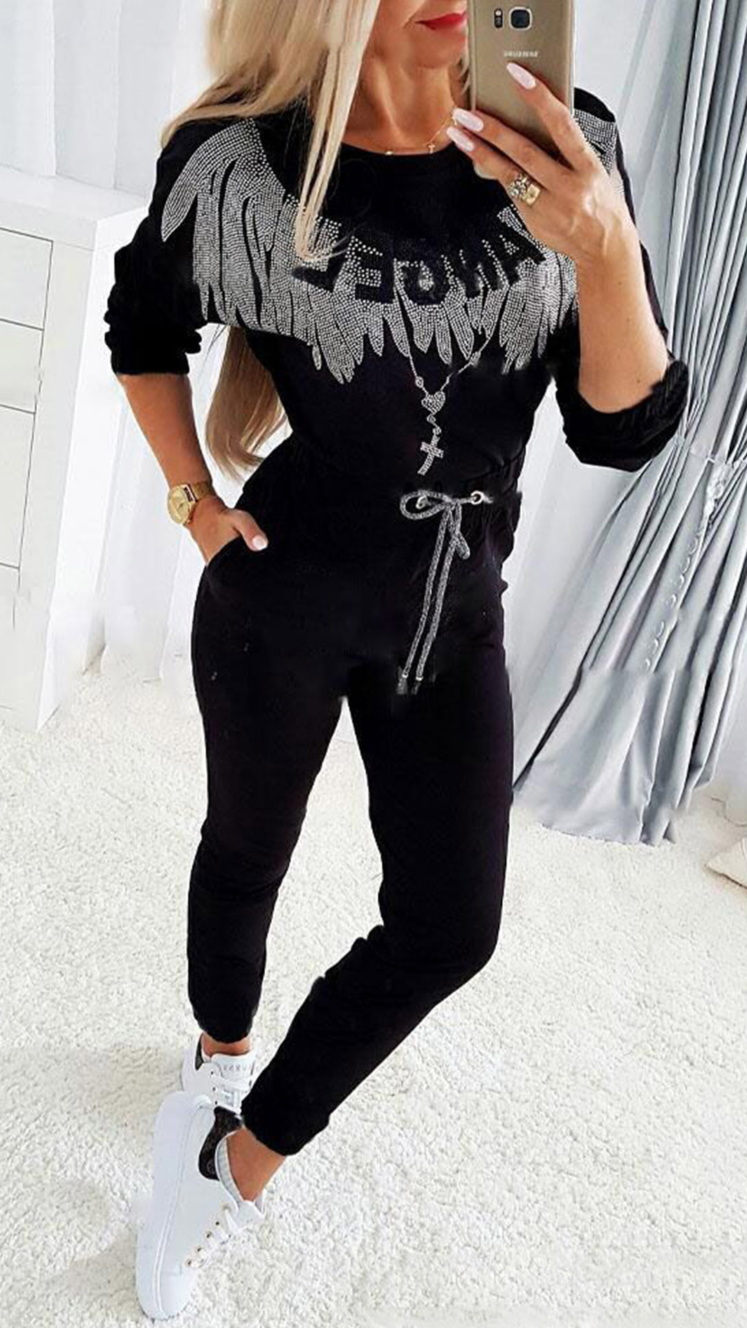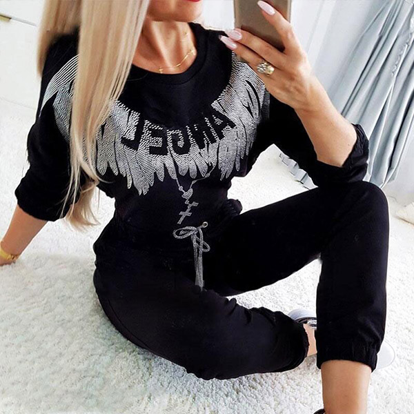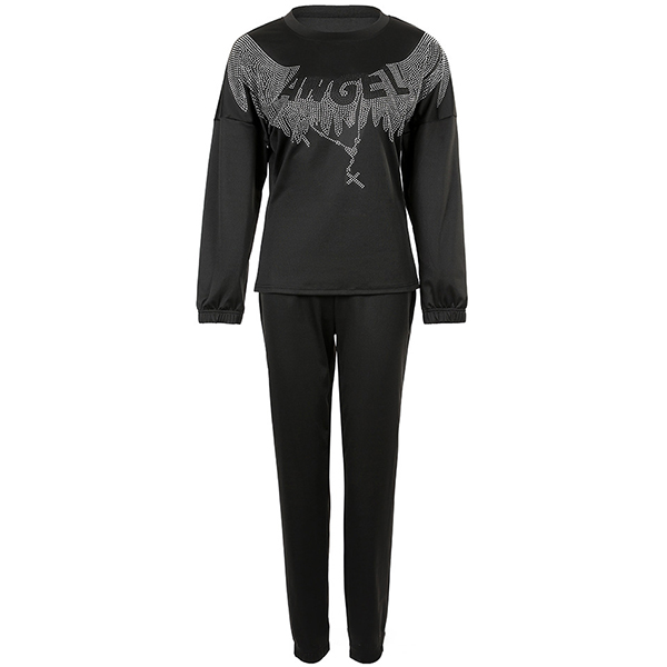 Fashion Rhinestone Spliced Long Sleeve Round Neck Sweatshirt + Pants Two-piece Set