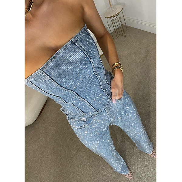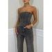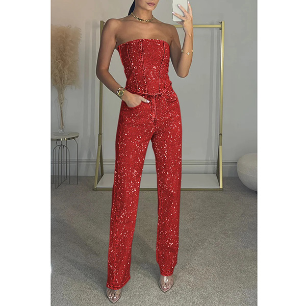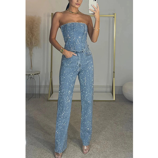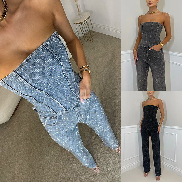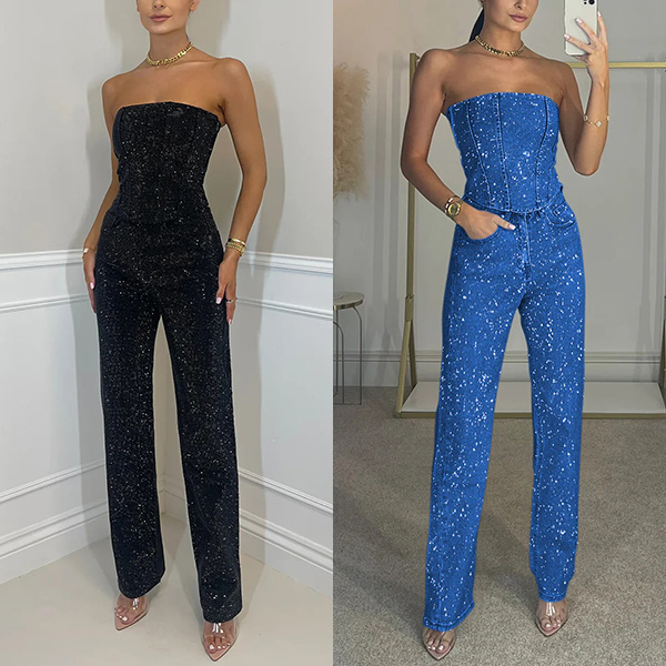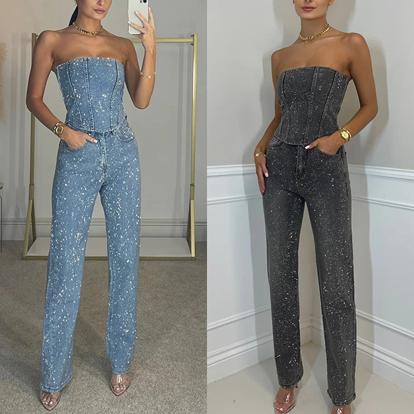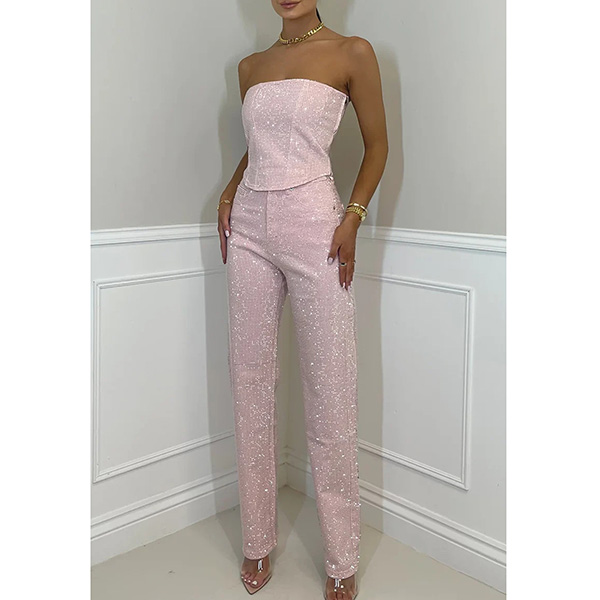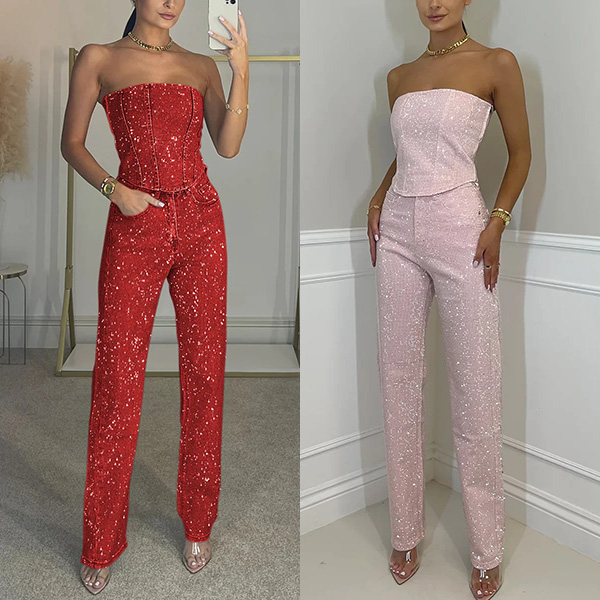 Fashion Rhinestone Two-piece Set Consist of Strapless Bandeau and Straight-cut Pants