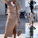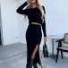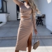 The ribbed texture of the fabric adds a touch of sophistication, while the criss-cross design on the crop top creates a unique and eye-catching detail. The skirt features a stylish high slit that adds a hint of allure and showcases your legs. It offers both comfort and style, making it perfect for a night out or a special event.