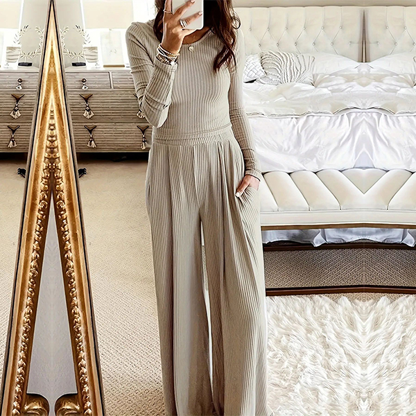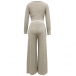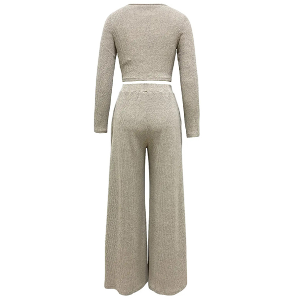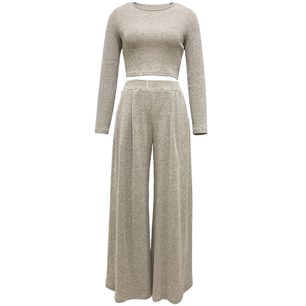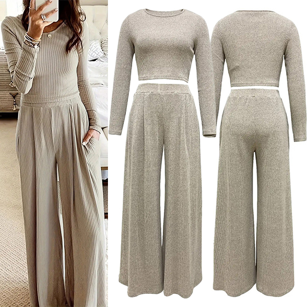 Crafted from high-quality ribbed fabric, this two-piece set is comfortable and figure-flattering, making it a versatile option for various occasions. It consists of a crop top and wide-leg pants, creating a trendy and coordinated look that is perfect for a chic and stylish outfit.