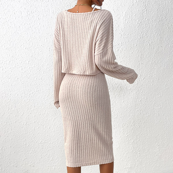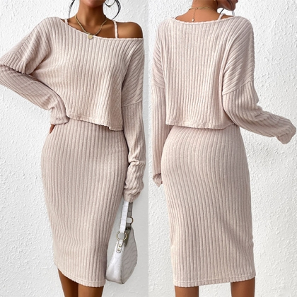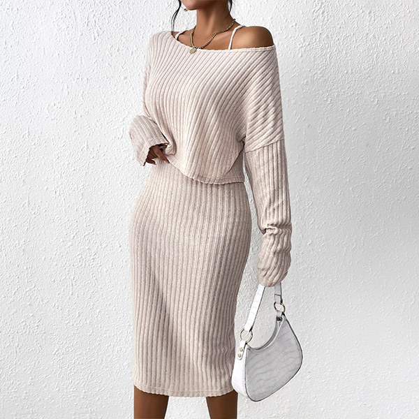 Fashion Ribbed Two-piece Set Consist of Round Neck Shirt and Pencil Skirt