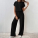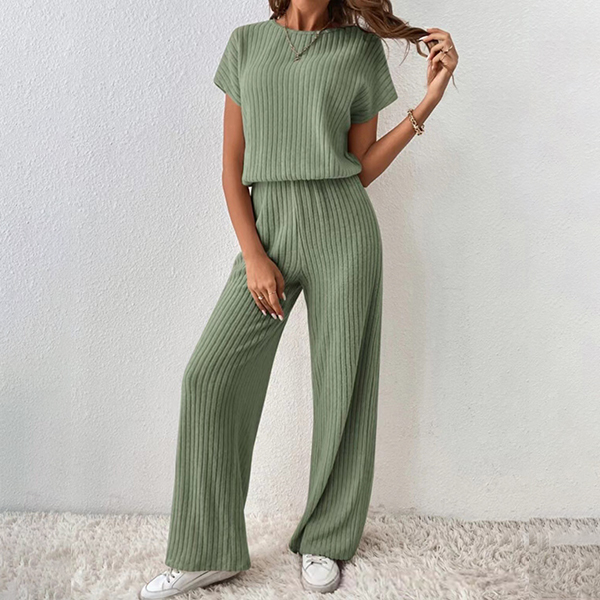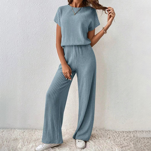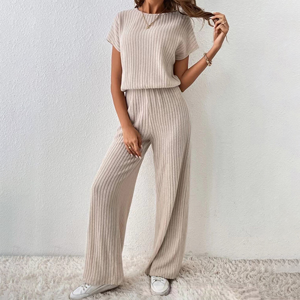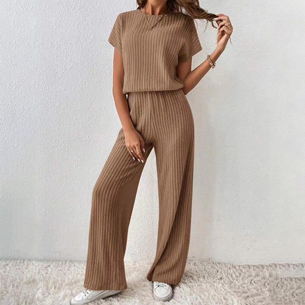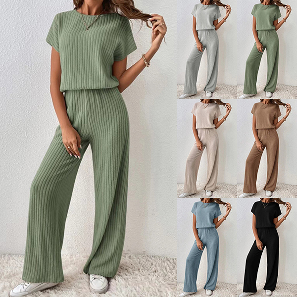 This Two-piece Set consists of a round neck shirt and straight-cut pants. The ribbed fabric is often chosen for its stretch, softness, and breathability. It allows for easy movement while providing a flattering and comfortable fit.