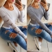 Fashion Ripped Long Sleeve Round Neck Heart Beaded T-shirt