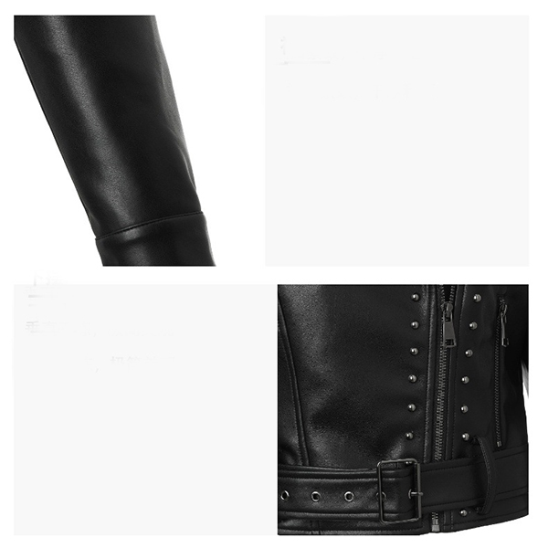 Fashion Rivet Notch Lapel Long Sleeve Slant Zipper Artificial Leather PU Jacket