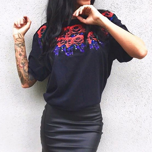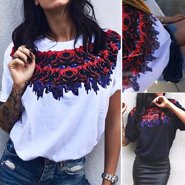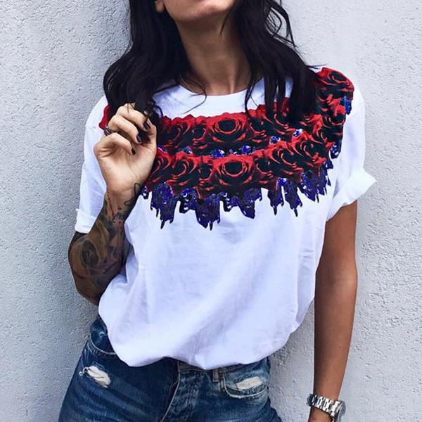 round neck and a loose silhouette,this t-shirt of course can keep you comfy all day. Plus,its rose printed details make this