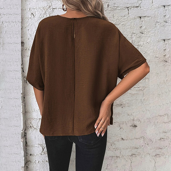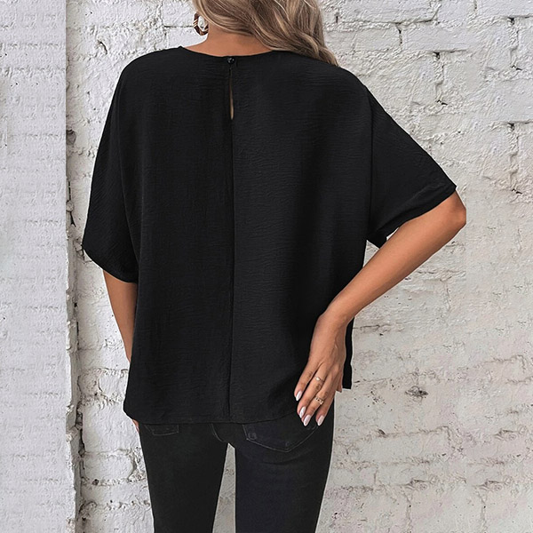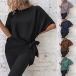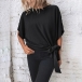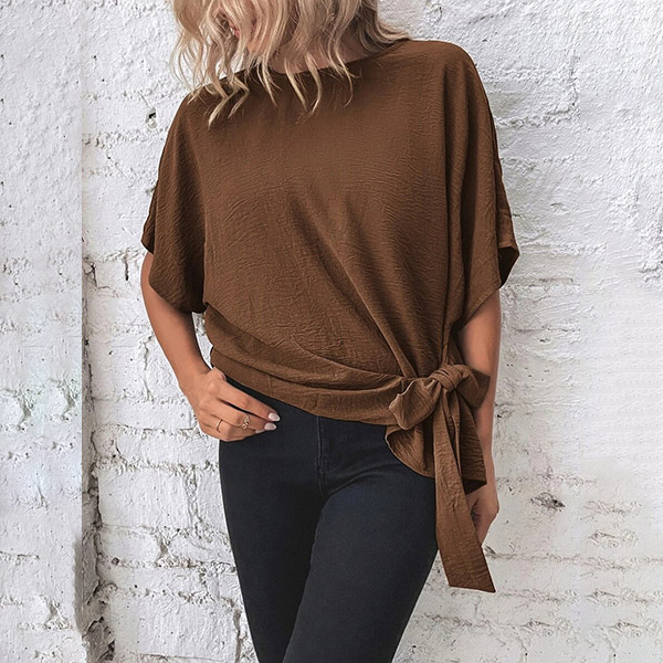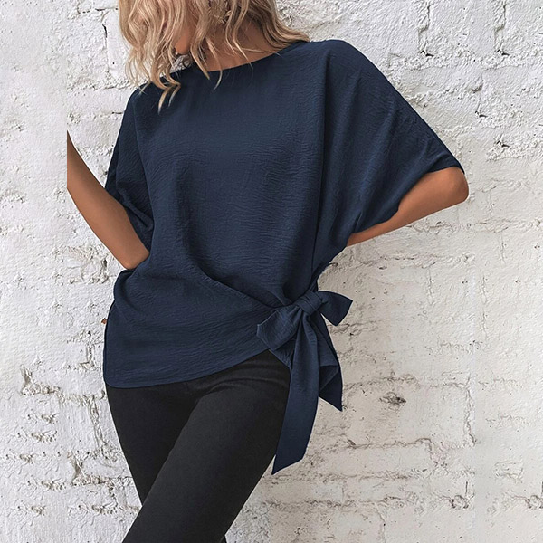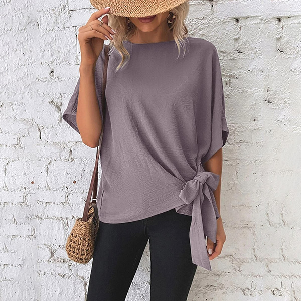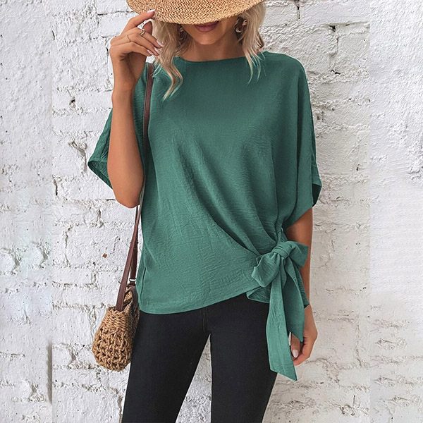 This shirt features a round neckline, batwing sleeves, and a self-tie bowknot detail on the hemline for a chic and playful look. Crafted from high-quality fabric, this shirt ensures both comfort and style.