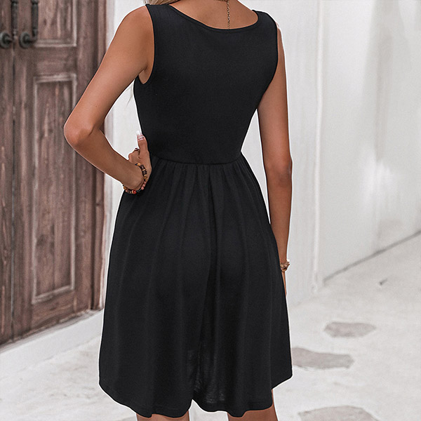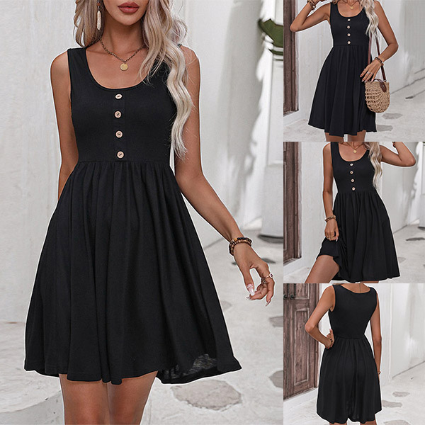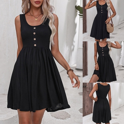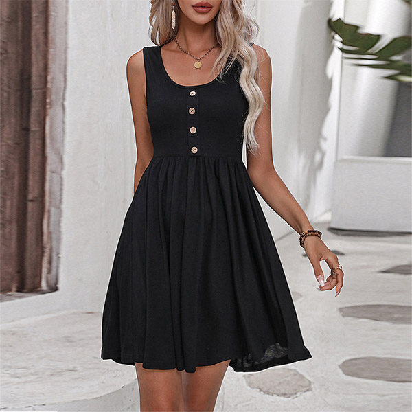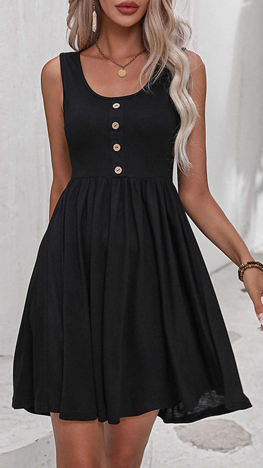 This casual dress feature a round neckline, sleeveless design, button details, and a mini length for a chic and trendy look.