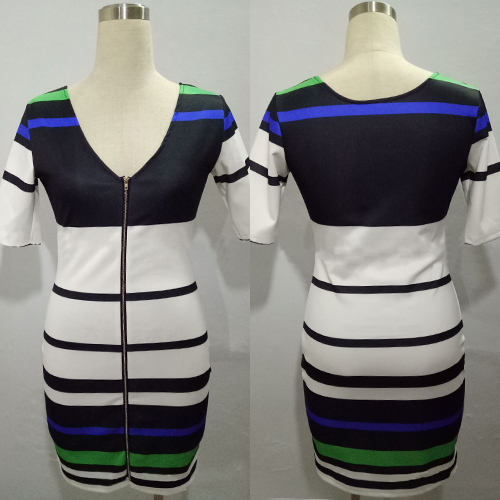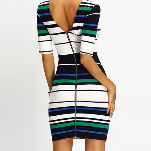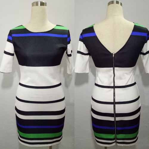 neck, backless and half sleeve design, fashion and sultry. Its slim-fitting silhouette and colorful striped add