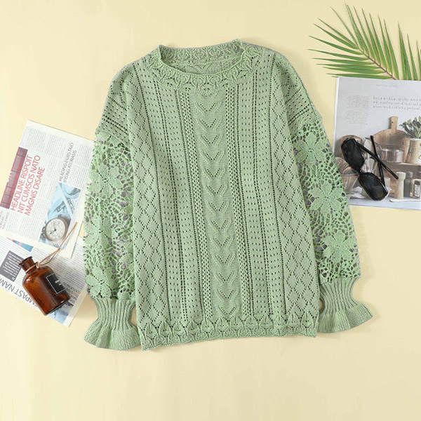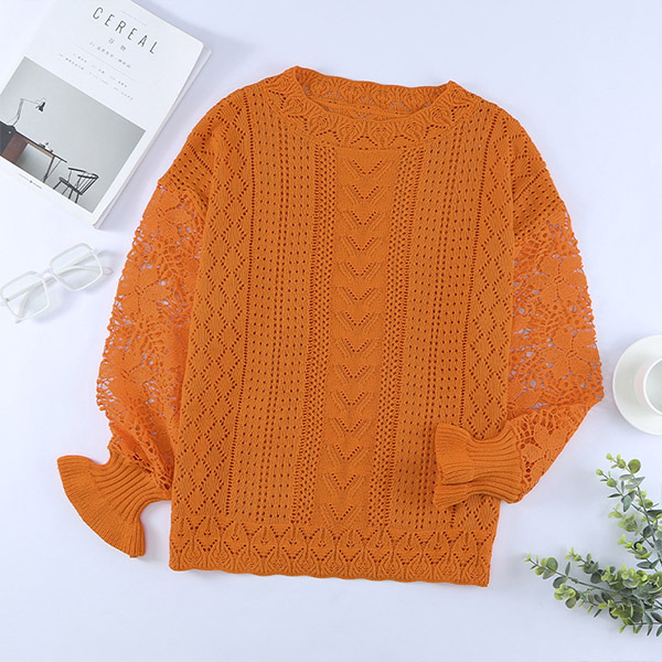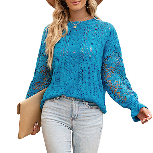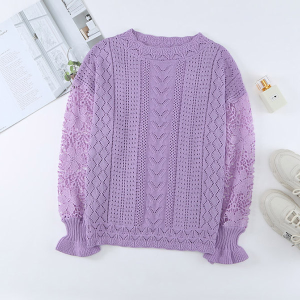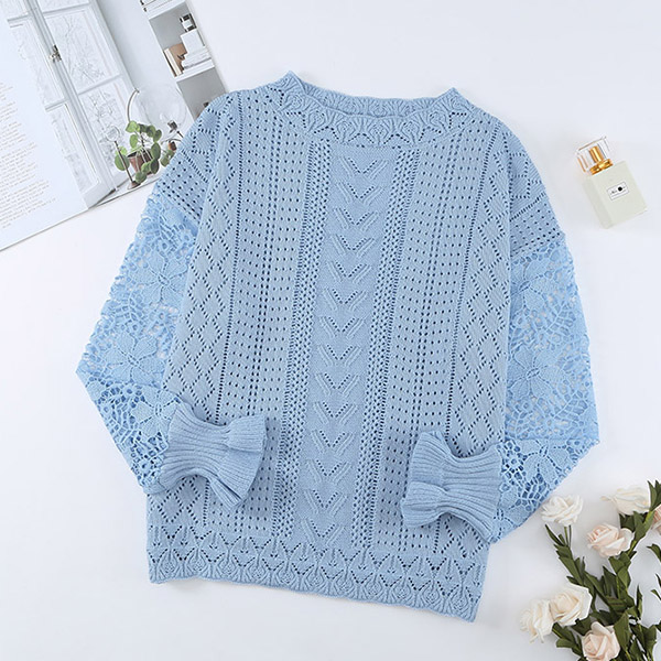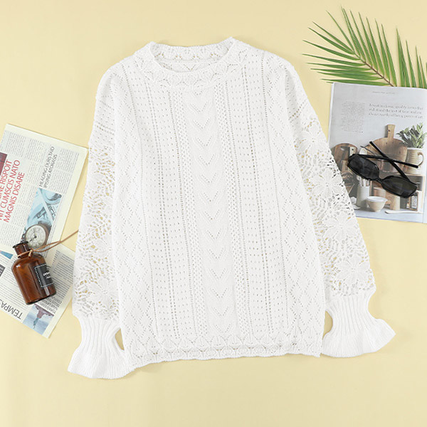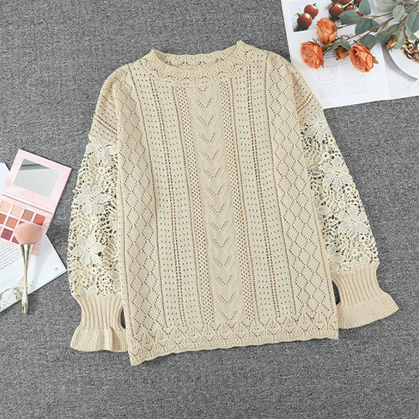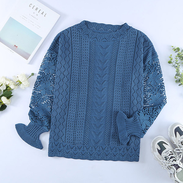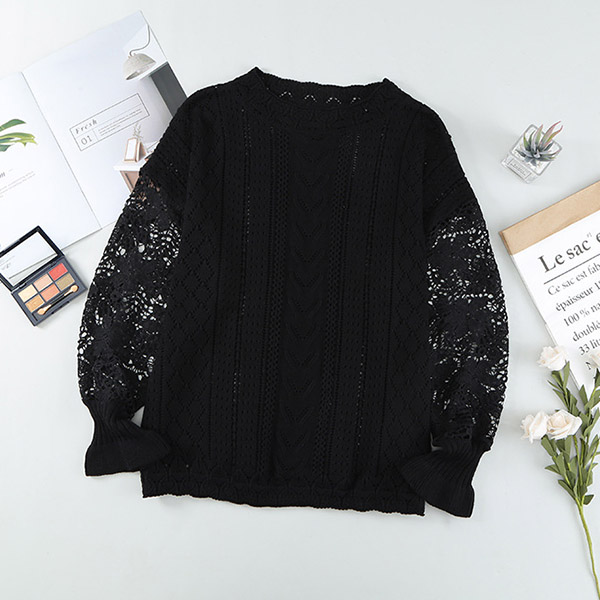 Fashion Round Neck Lace Spliced Long Sleeve Knitted Shirt