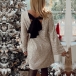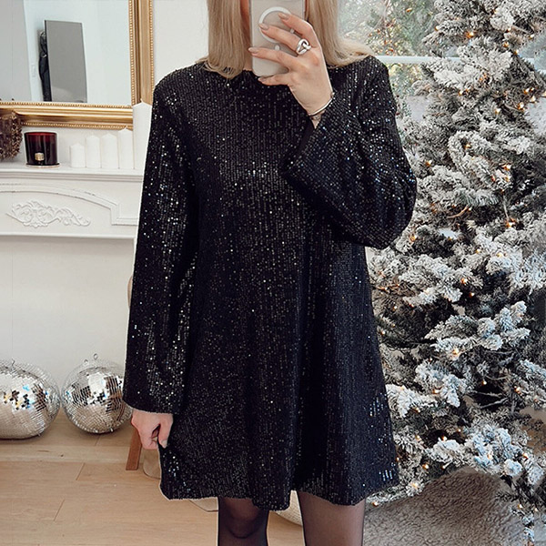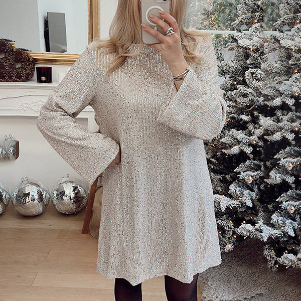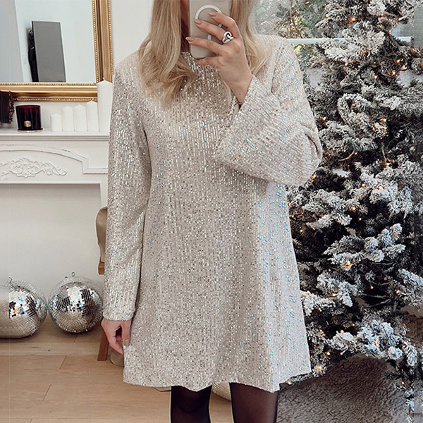Fashion Round Neck Long Sleeve Backless Bowknot Sequined Mini Dress