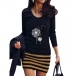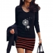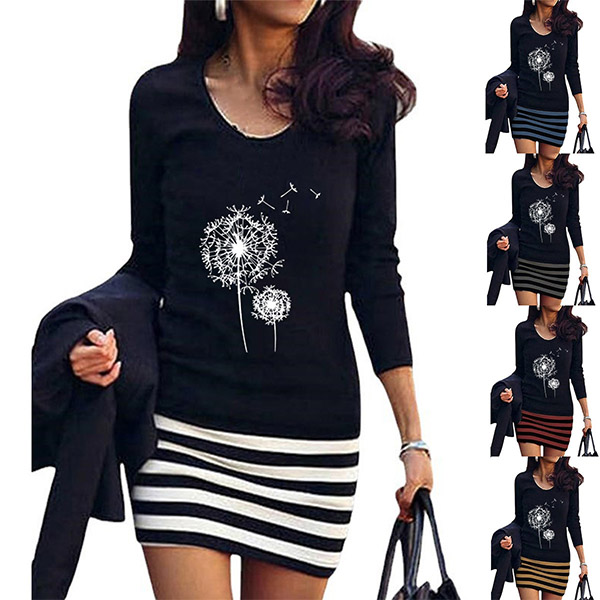 Fashion Round Neck Long Sleeve Floral Printed Stripe Printed Bodycon Dress