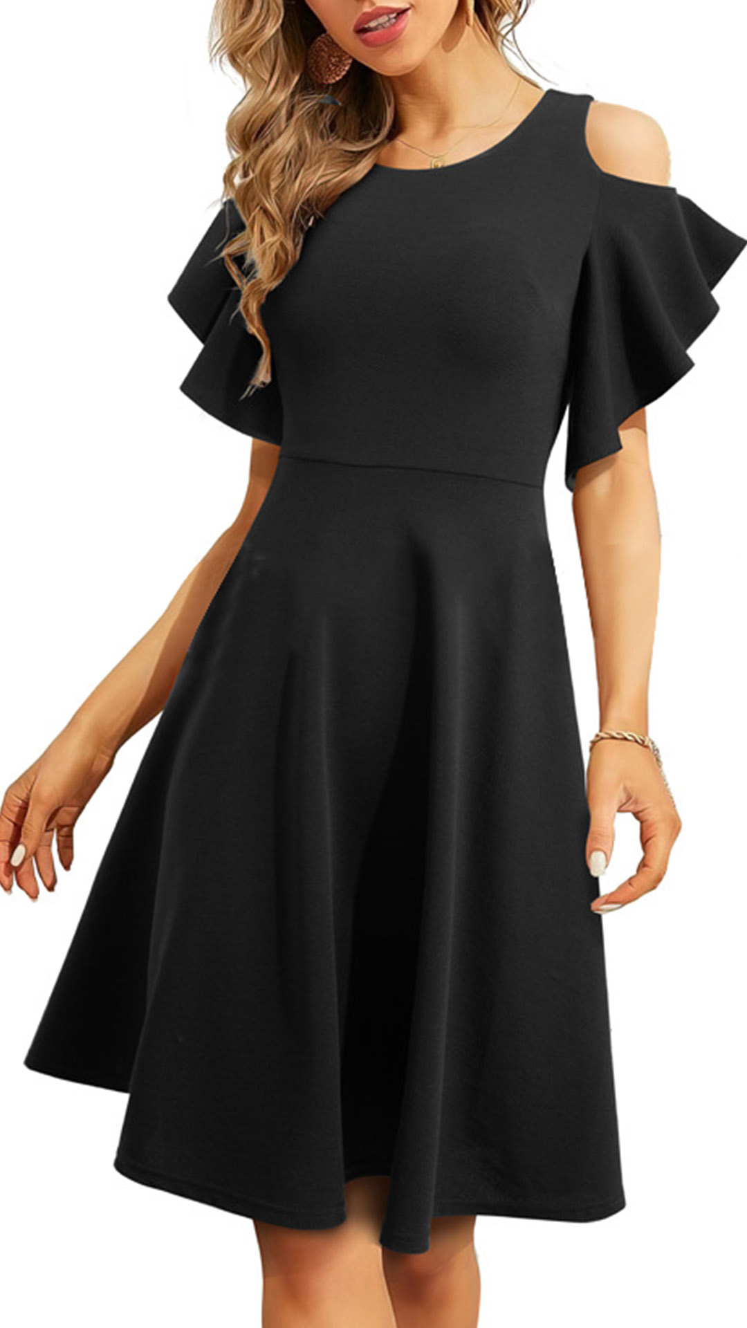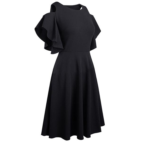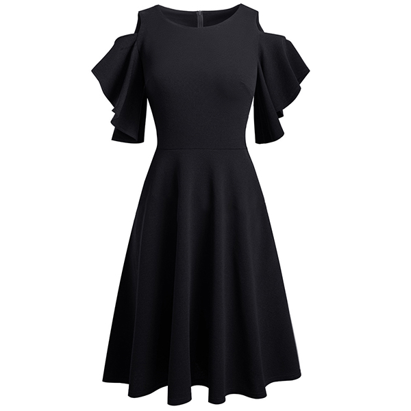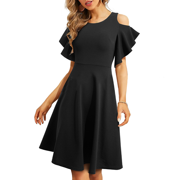 This stylish mini dress features a round neckline, open-shoulder details, short sleeves, and a high-rise waistline, creating a flirtatious and contemporary silhouette. Wanna have a try?