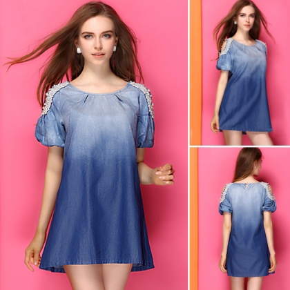 Enjoy the comfort and stylish feeling in this denim dress. It features fashion round neck,short sleeve design.
