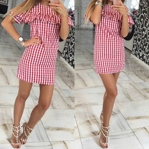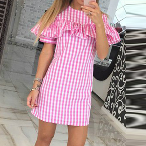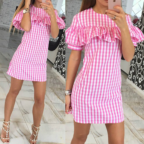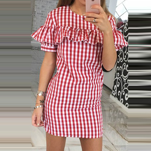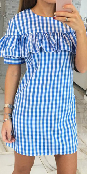 Featuring round neck, short sleeve, grids and ruffle design, this dress can let you become the focus