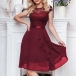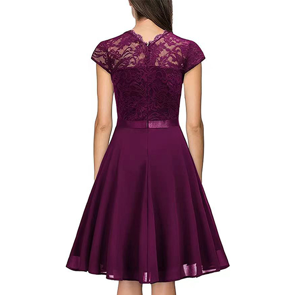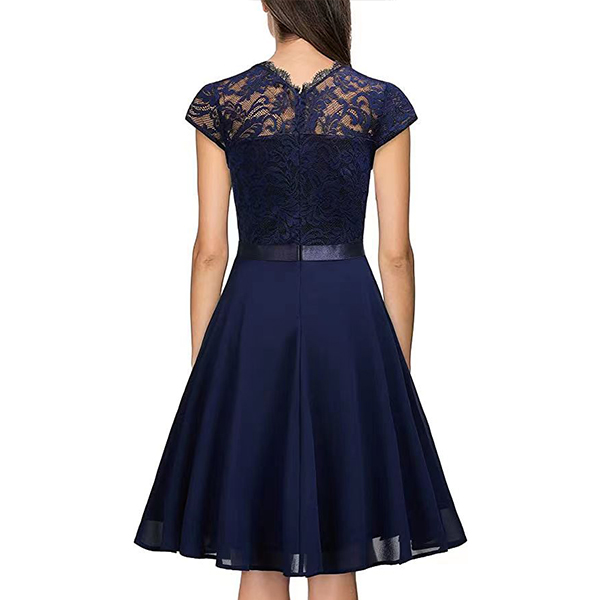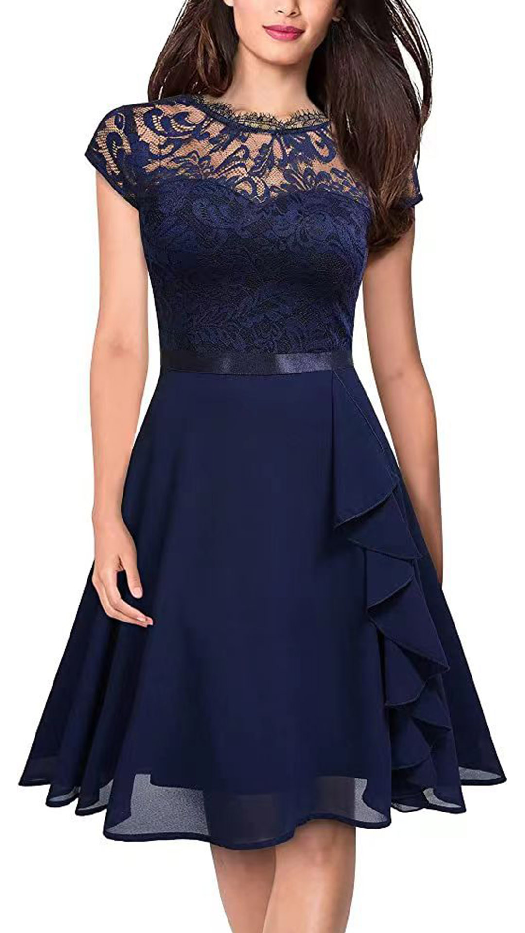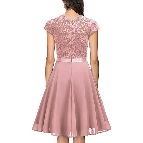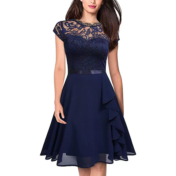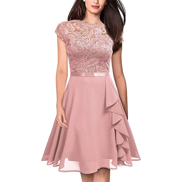 This elegant dress features a round neckline and short sleeves. It combines delicate lace panels bodice with airy chiffon fabric skirt, creating a beautiful contrast of textures. The standout detail is the ruffle design on the skirt, adding a romantic, feminine touch.