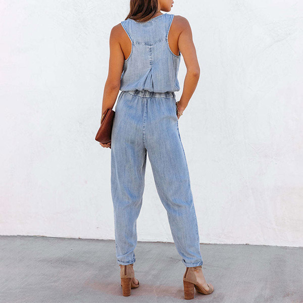 Fashion Round Neck Sleeveless Elastic Drawstring Waist Old-washed Denim Jumpsuit