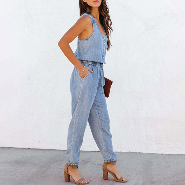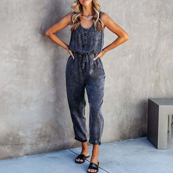 This jumpsuit features a round neckline, sleeveless design, and an elastic drawstring waist, all crafted from a classic old-washed denim fabric. Three-colors, which one do you like?