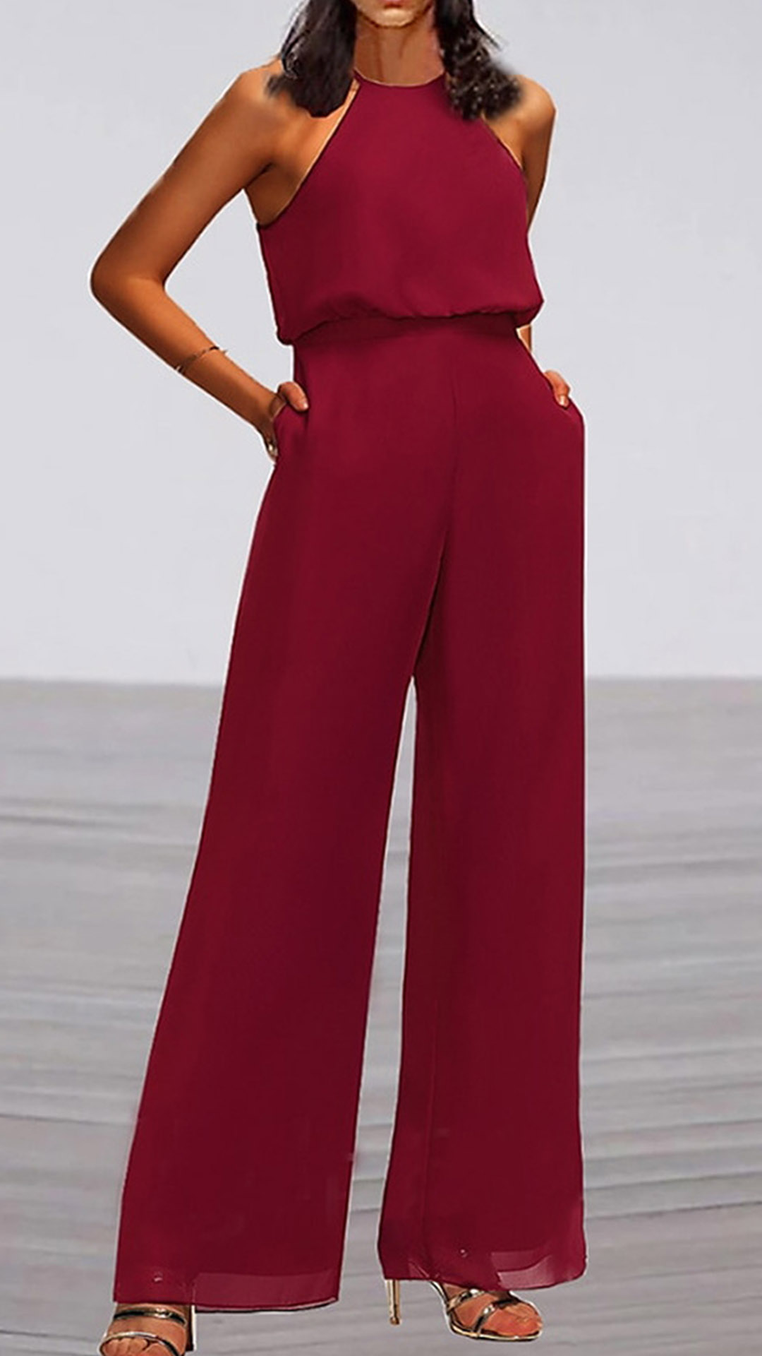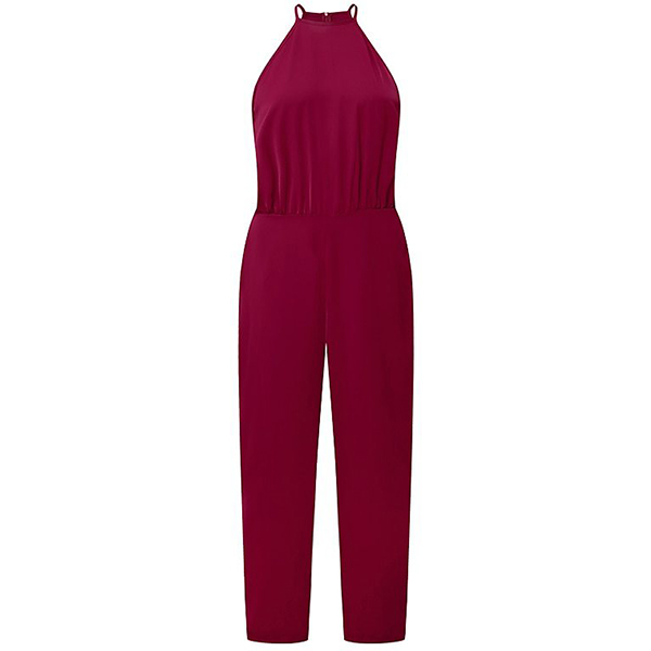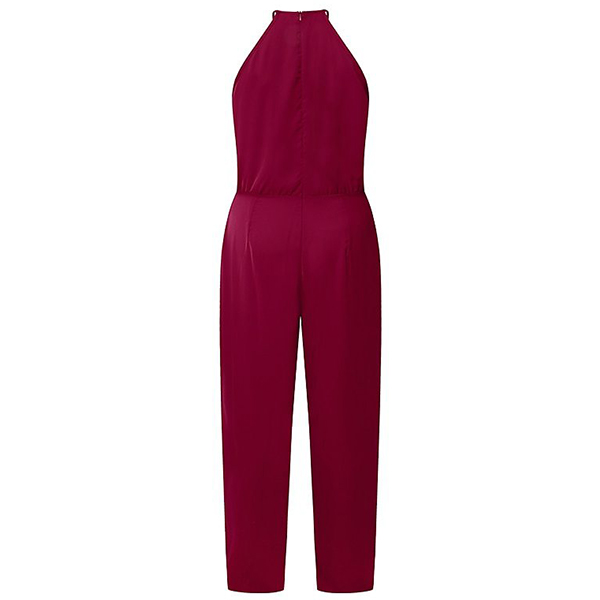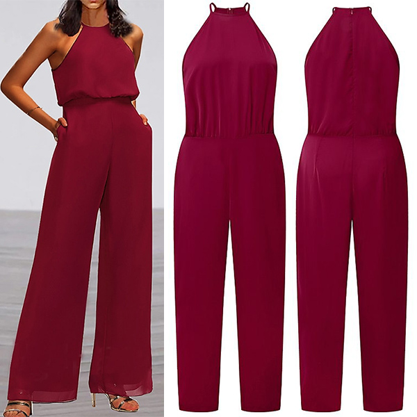 This chic jumpsuit features a classic round neckline, sleeveless design, and a flattering high-rise silhouette with a straight-cut leg, offering a versatile and fashionable outfit for various occasions. The straight-cut leg adds a sleek and tailored touch, enhancing the overall silhouette.