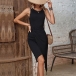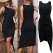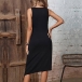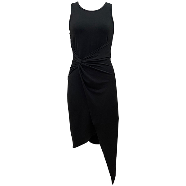 This black dress features a round neckline, a sleeveless silhouette, a knotted detail for ruched effect, and an irregular hemline, creating a visually striking and body-hugging design that exudes a confident and modern aesthetic. Wanna have one?