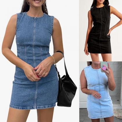 Fashion Round Neck Sleeveless Old-washed Denim Dress