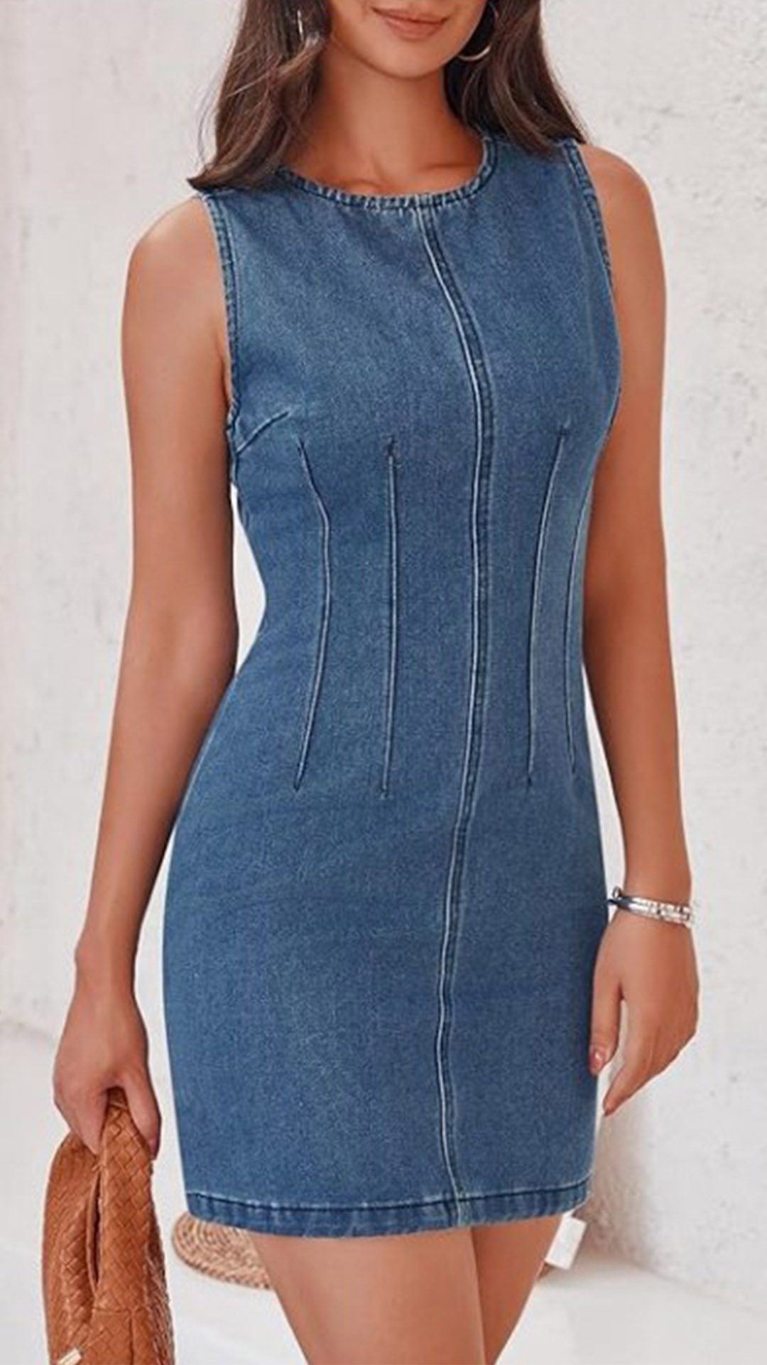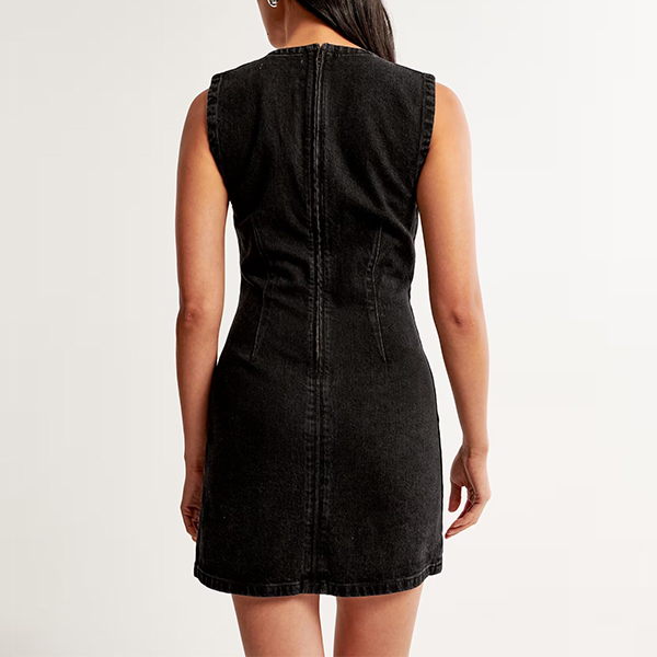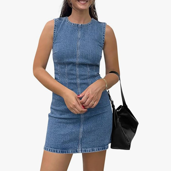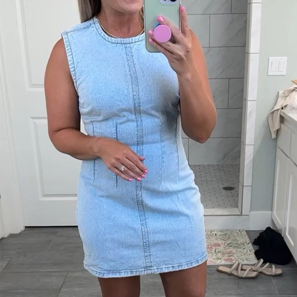 This denim dress features a classic round neckline that offers a timeless and versatile style. It also has high-rise and bodycon slihoutte for a trendy and casual look. It also allows for easy layering with a cardigan or jacket for added versatility during transitional seasons.