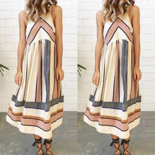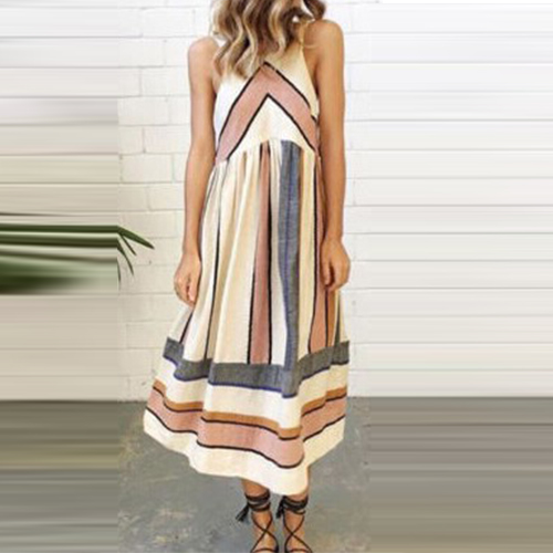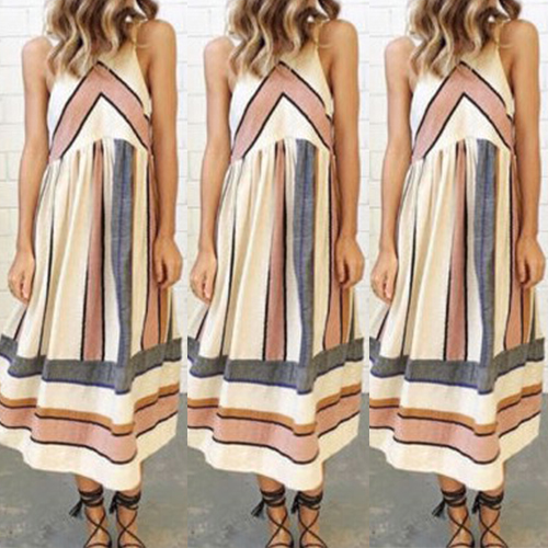 Fashion Round Neck Sleeveless Printed Striped Maxi Dress
