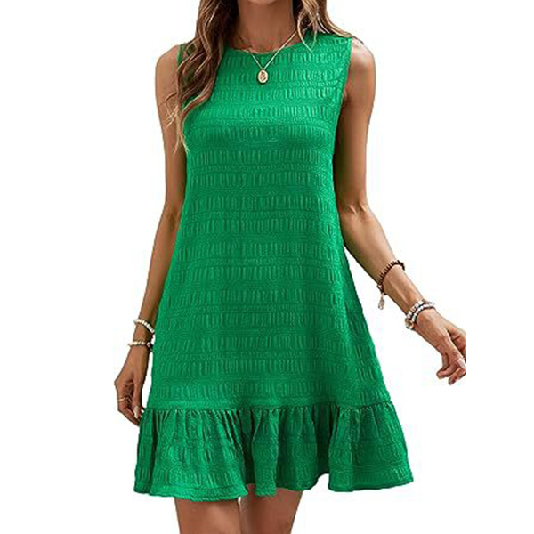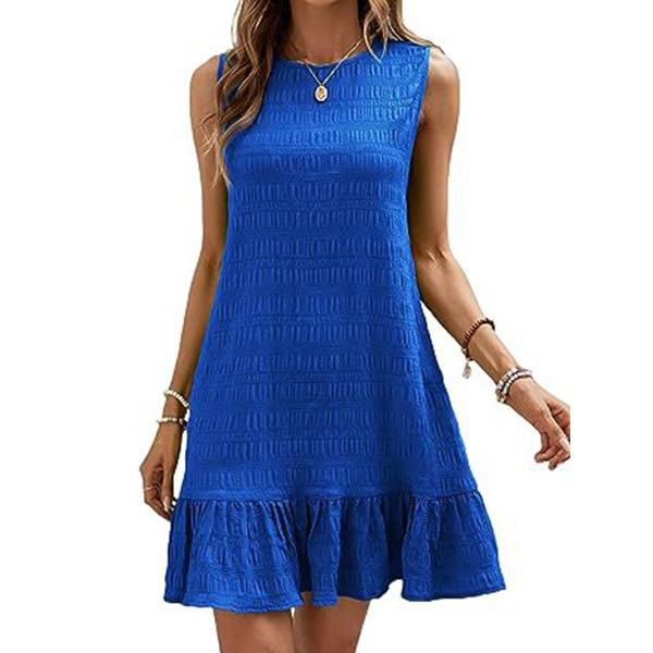 This is a stylish and versatile dress that combines a round neck, sleeveless design, and a ruffled hemline for a fashionable and feminine look.