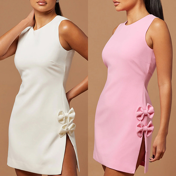 This dress features a classic round neckline, sleeveless design, alluring side slit, and a charming bowknot detail, creating a fashionable and figure-flattering ensemble. White and pink, which one do you like?