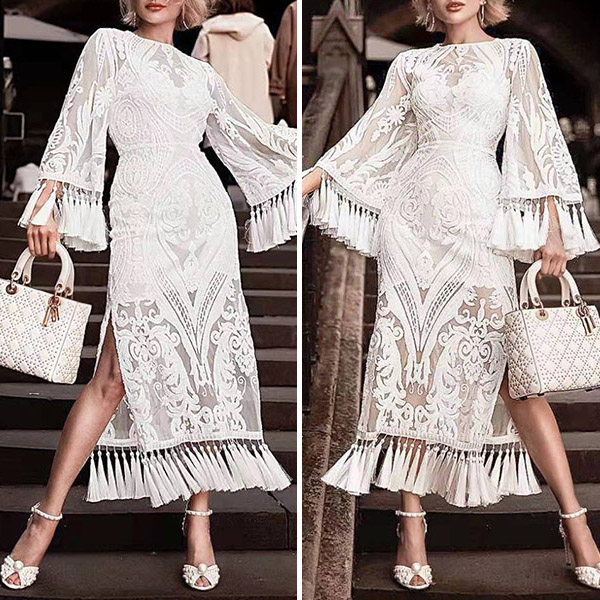 This dress is the epitome of elegance and style, featuring a round neck elbow sleeve and a flirty slit that adds an exciting twist. The unique tassel hemline gives this dress a playful yet sophisticated appeal, making it an excellent choice for both casual and formal occasions.