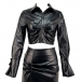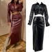 Fashion Ruched Artificial Leather PU Two-piece Set Consist of Crop Blouse and Side Slit Maxi Skirt