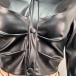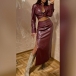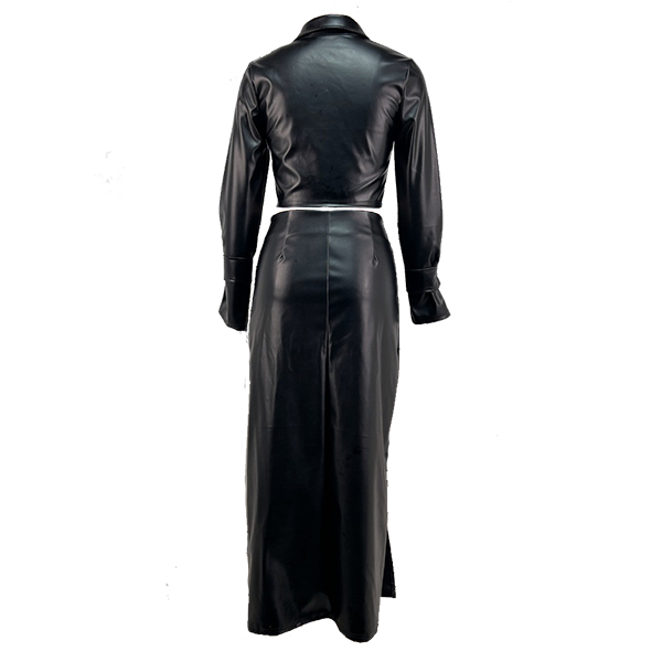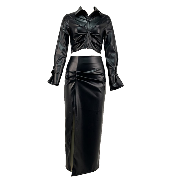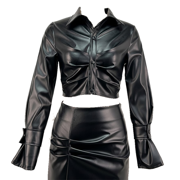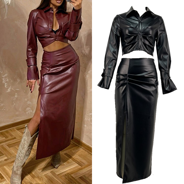 This striking two-piece set features crop blouse paired with elegant side slit maxi skirt for modern edgy sophistication. The ruched details provides flattering texture with body-enhancing appeal whilst the artificial leather construction adds structured edge and urban contemporary styling. Wanna have a try?