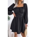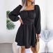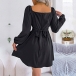 Fashion Ruched Square Neck Long Sleeve Self-tie Mini Dress