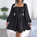 Make a statement in this black mini dress! The square neckline adds a modern and chic touch to the dress, while the ruched detailing creates a flattering and figure-enhancing silhouette. The self-tie waist allows you to cinch in the waist for a customized and flattering fit. It is perfect for daily wear.