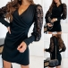 Fashion Ruched V-neck Gauze Spliced Long Sleeve Bodycon Dress