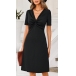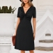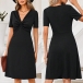 This dress combines a classic black color, a flattering V-neckline with ruched detailing, and short sleeves, creating a versatile and stylish ensemble that is perfect for any occasion. The fabric is comfortable, stretchy, and designed to provide a flattering and comfortable fit.