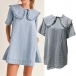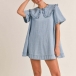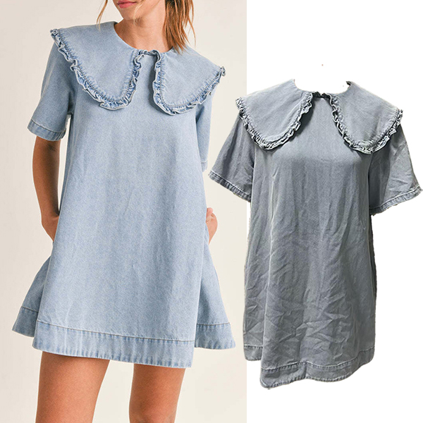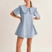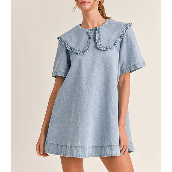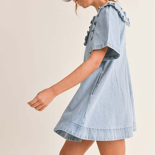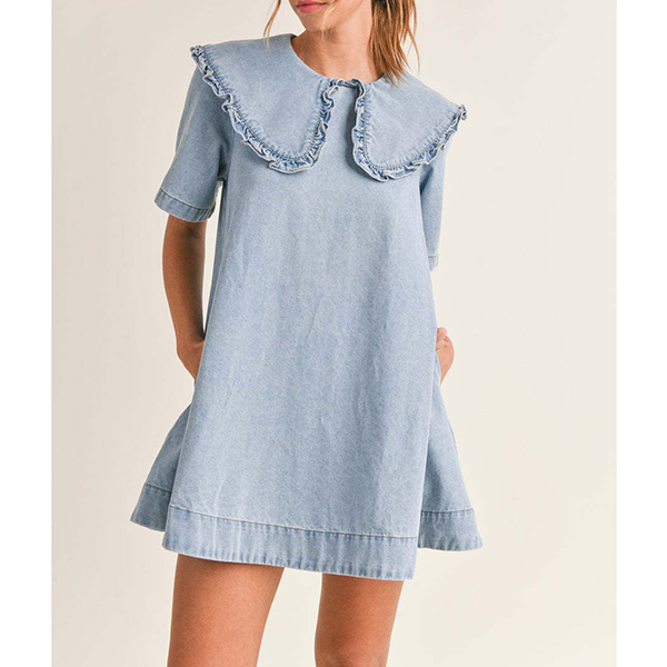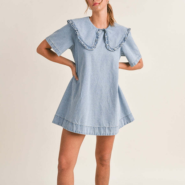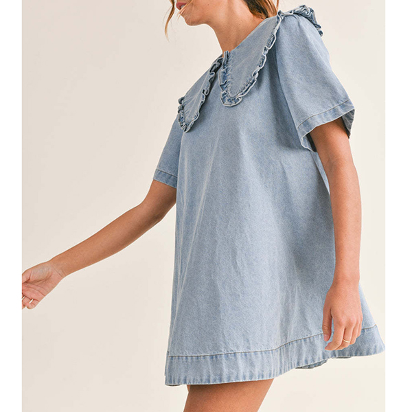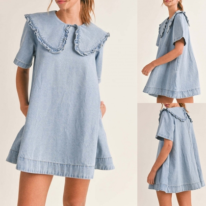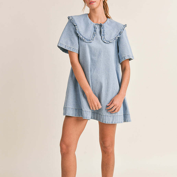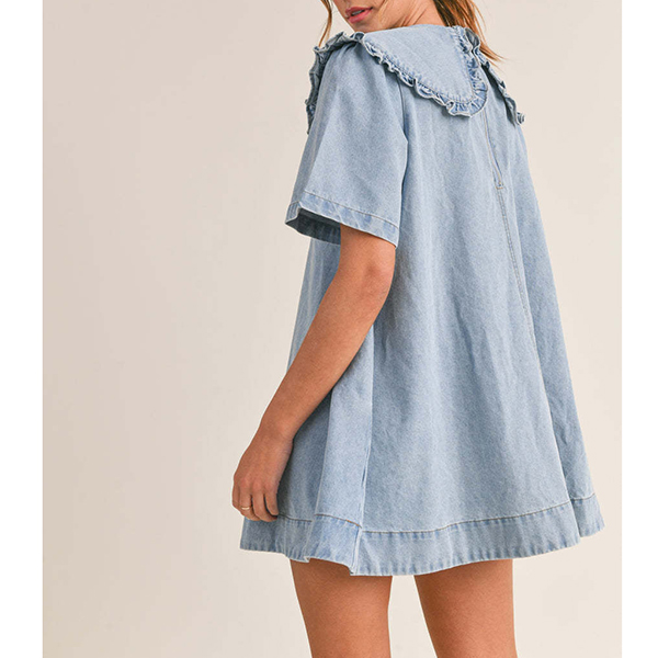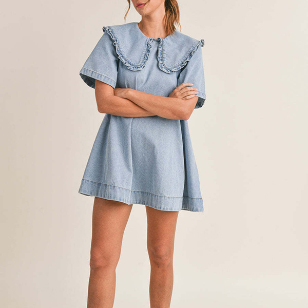 Capture a playful yet stylish look with this Mini Denim Dress. This charming dress features a sweet ruffle doll collar and short sleeves, adding a touch of vintage flair. Pair it with ankle boots or sandals for a fashion look.