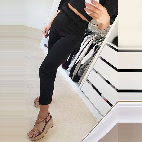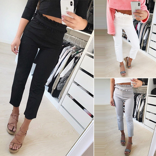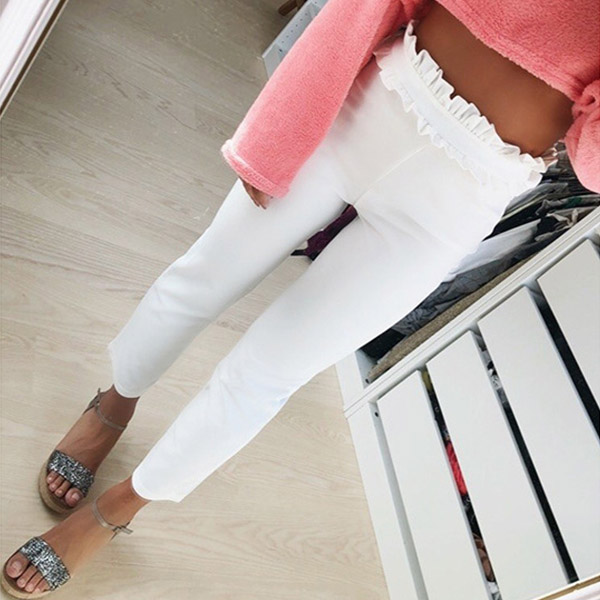 Except for the jeans,shorts and skirts,this pants is your another good choice. Solid color style,the high waist and fit silhouette design can showcase your slender legs and figure,while the ruffle design at the waist part will lend you a dash of sweet and stylish vibes. If you wanna look sexy and flirty,then you can consider adding a crop top.