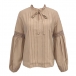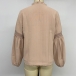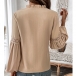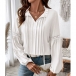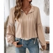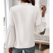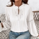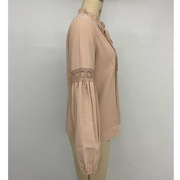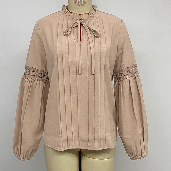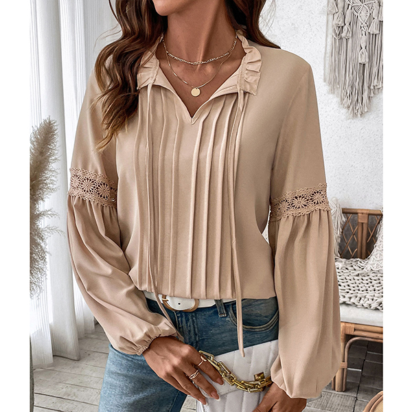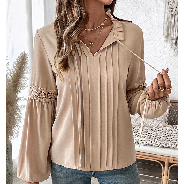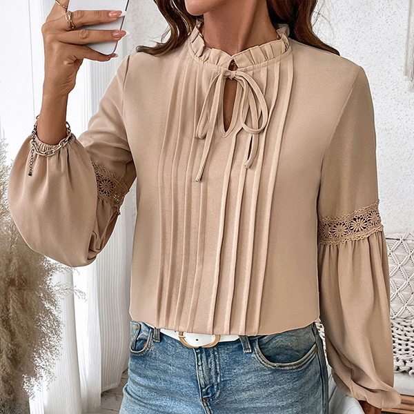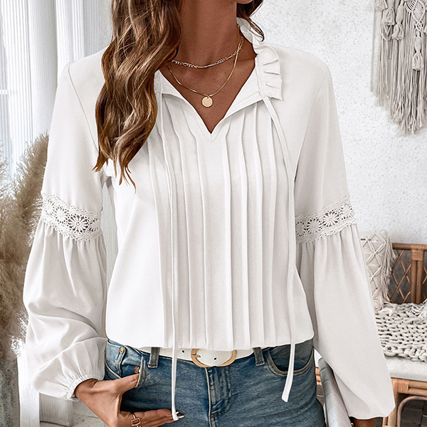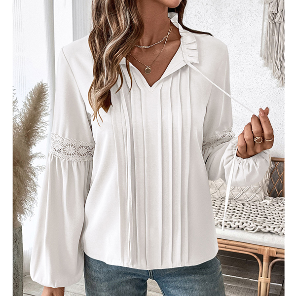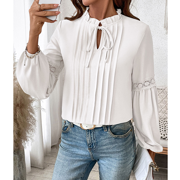 This distinctive shirt features delicate ruffled detailing along the neckline . The classic crew neckline provides a timeless foundation enhanced by an adjustable self-tie feature that adds customizable styling options and charming visual interest. Exquisite lace splicing along the long sleeve for sophisticated textural contrast. Precisely crafted pleating adds architectural structure and creates beautiful movement with every gesture. An ideal choice for daily wear.