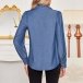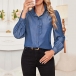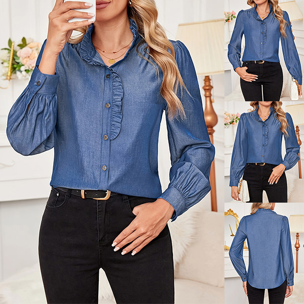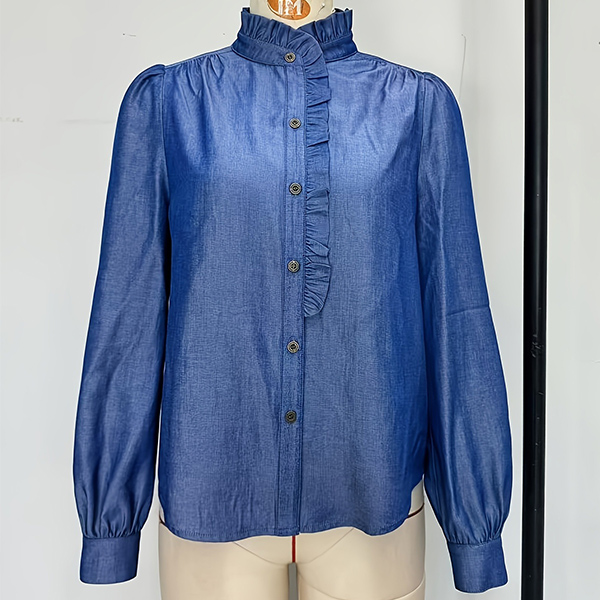 This elegant blouse features a ruffle stand collar that adds a touch of sophistication and charm. The long sleeves and front button design create a classic and versatile look, perfect for both professional and casual settings. Pair it with jeans for a chic, everyday style.