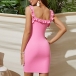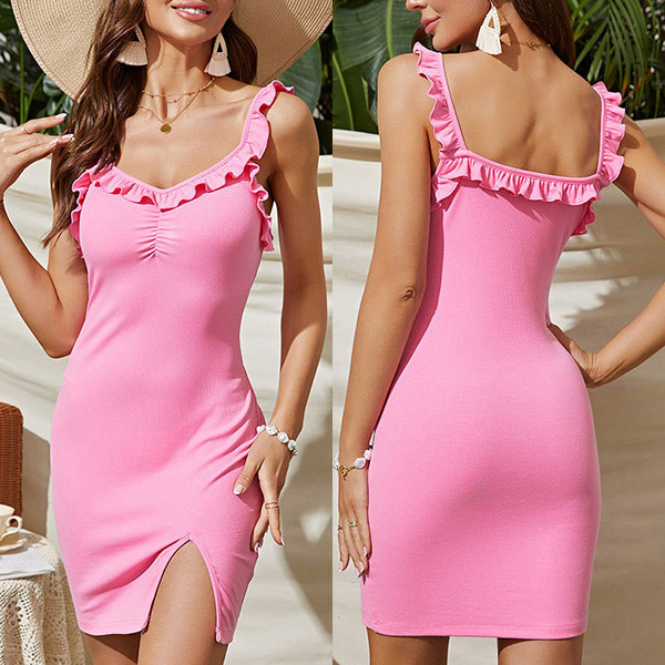 This pink dress features a ruffle details along the V-neckline and shoulder strap for a glamorous and sweet look.