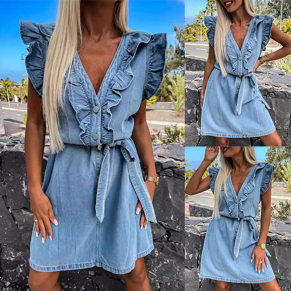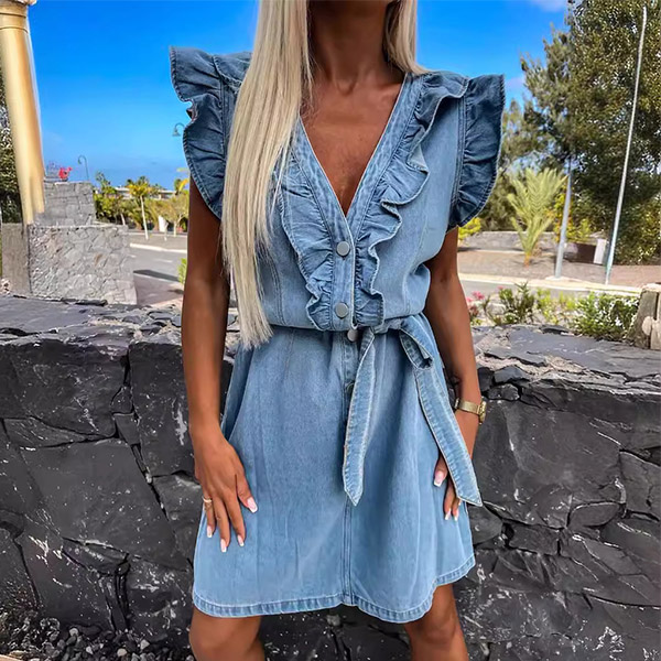 This denim dress features a ruffle V-neckline, sleeveless design, self-tie waist, and a denim fabric, creating a trendy and versatile ensemble that is perfect for a variety of occasions. Wanna have a try?