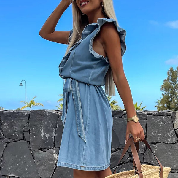Fashion Ruffle V-neck Sleeveless Self-tie Waist Denim Mini Dress