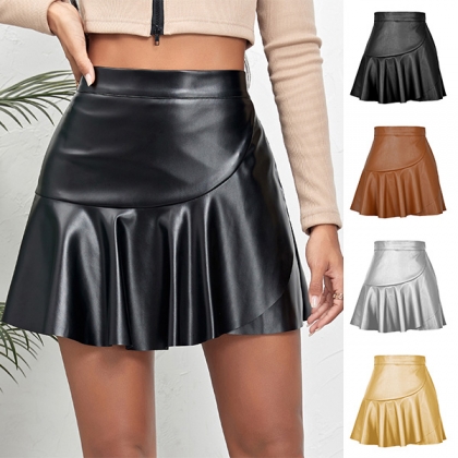 Fashion Ruffled Hemline Artificial Leather PU Skirt