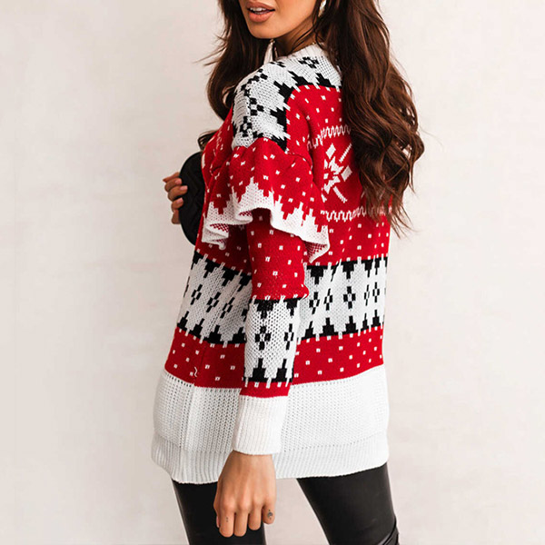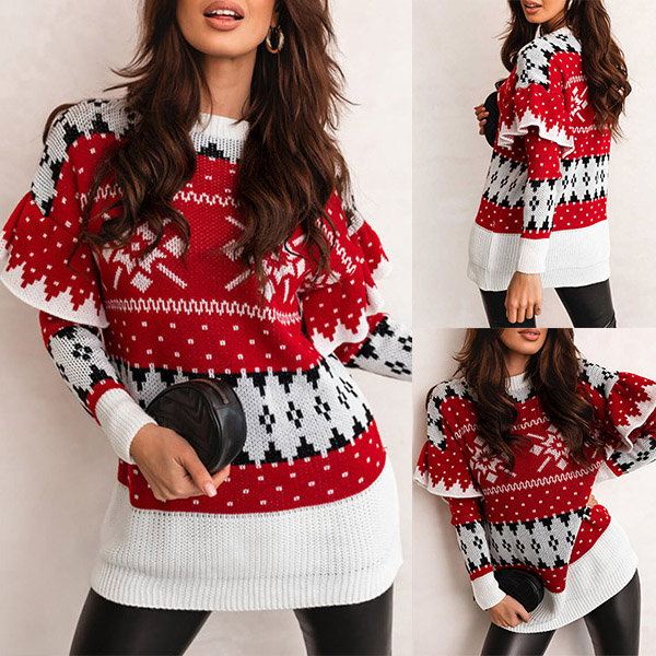 This festive sweater dress is perfect for your holiday parties! The ruffled sleeves and round neck add a touch of femininity, while the snowflake pattern and long sleeve silhouette keep you cozy and warm.
