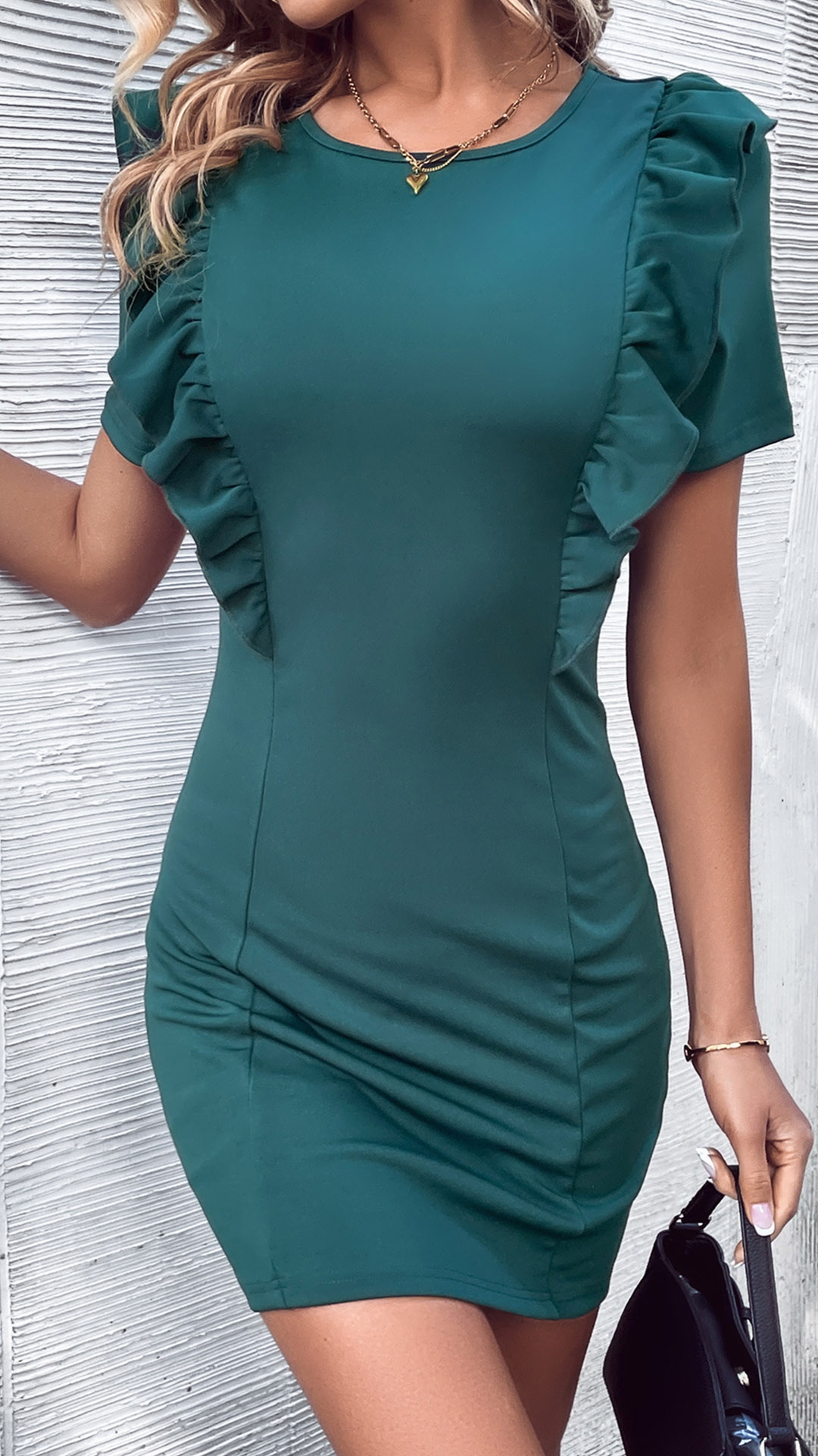 This fashion-forward bodycon dress features a front ruffled decoration, round neck, and short sleeves, perfect for a daily wear.
