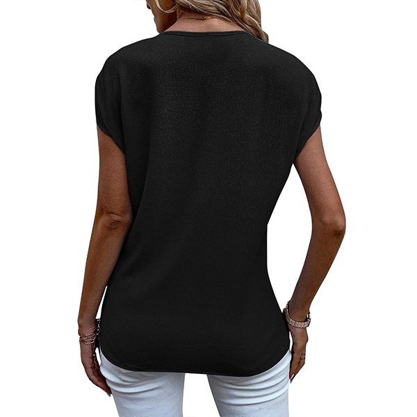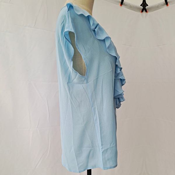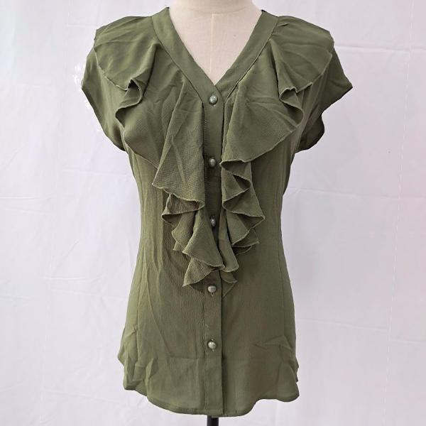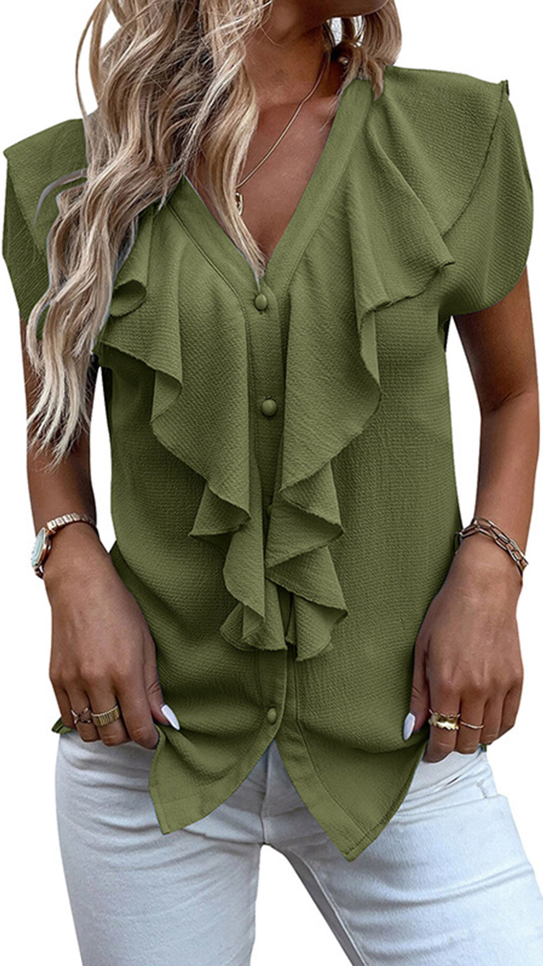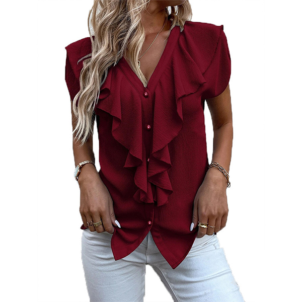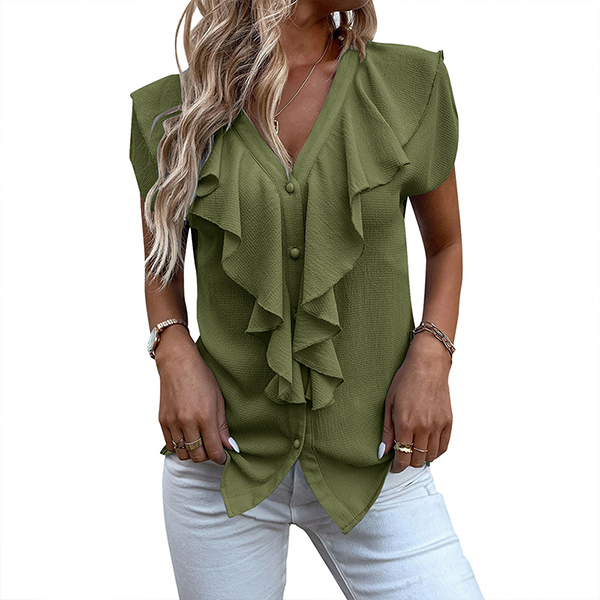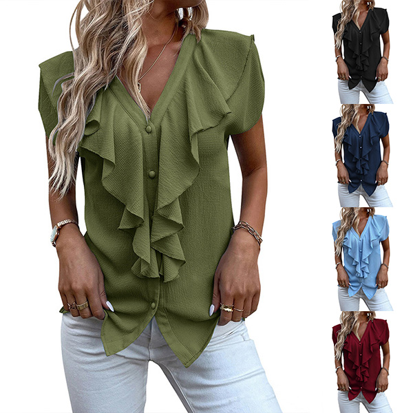 Fashion Ruffled V-neck Short Sleeve Buttoned Chiffon Shirt